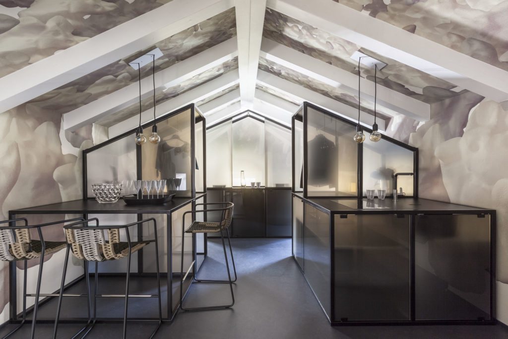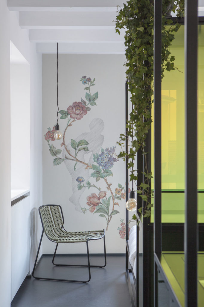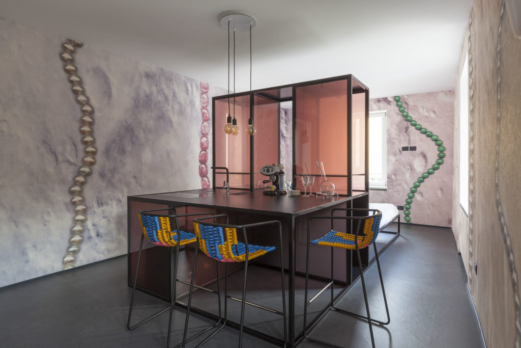 Contrasting with art are the design and realisation of the interior, personally created by Fabio Pasini from the architectural firm Krej, who has developed a new living solution, an alternative to the classic furnishing concept: at the centre of each room there are installations of iron and laminated glass which become, from time to time, parts of the lived environment. Every detail has been designed and made to measure by local craftsmen. The materiality of the furnishings fits into a global restructuring concept of blending shape and colour together, with dark floors and ceilings creating harmonious and yet functional spaces. The neutral décor defines the space, thus leaving the walls free for the wallpaper to unfold, offering a unique artistic-architectural experience.