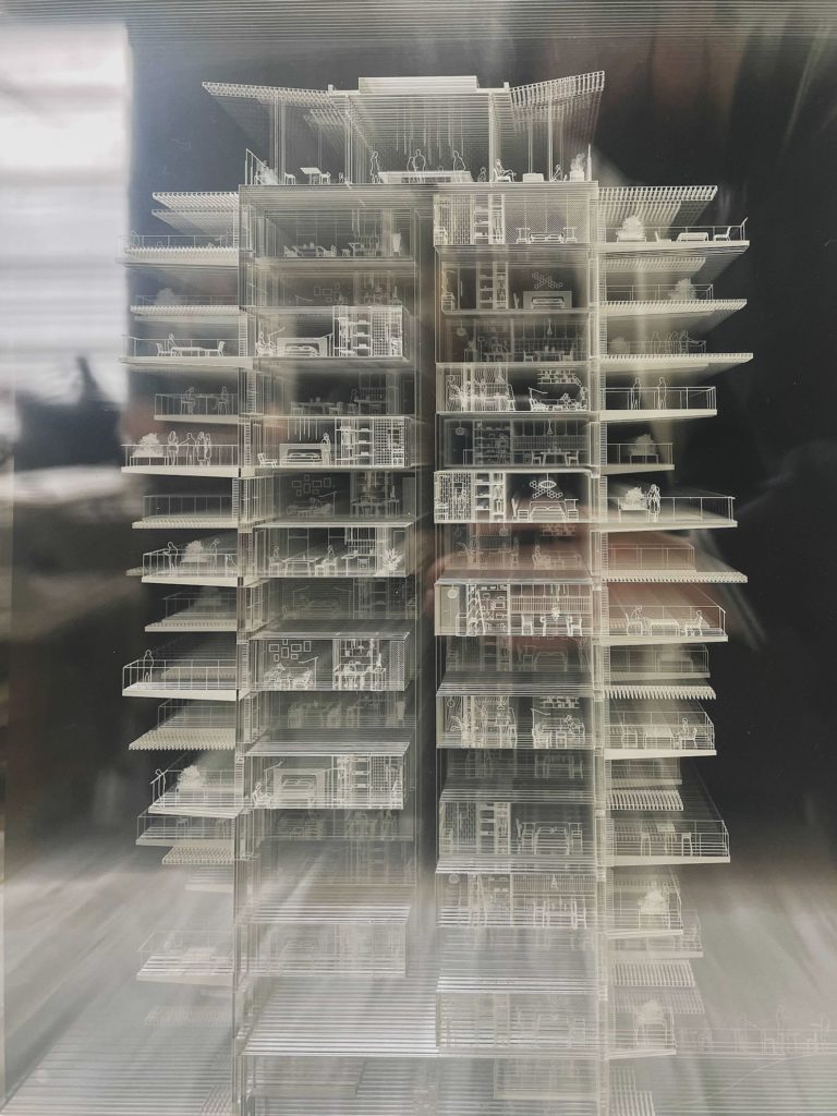 At the Arsenal on the occasion of the 17th International Architecture Exhibition – La Biennale di Venezia, Nicolas Laisné is unveiling for the first time his “projections”, holographic models, true signature of the agency. These projections reflect what we already know about the agency’s philosophy and its architectural know-how.Composed of a multitude of plexiglass models, they alone crystallize the fully open architecture and in symbiosis with the exterior made in Nicolas Laisné Architectes. The sense of depth thatthis juxtaposition gives, and the feeling of analmost holographic tower wonderfully conveysthe constant conversation between inside andoutside at NLA. The projection essentializesthis idea of an architecture that is not a wallbetween the inside and the outside, but a realinvitation to encounter the environment.