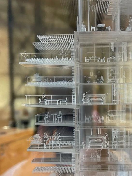 Furthermore, the screens, videos and plexiglass models will serve to explain the role of the integrated functions of the building: co-living; / co-working / urban farming / rooftop leisure facilities / communal sports facilities / services for the community / underground farming / outdoor living / school for community / learning & research centre.