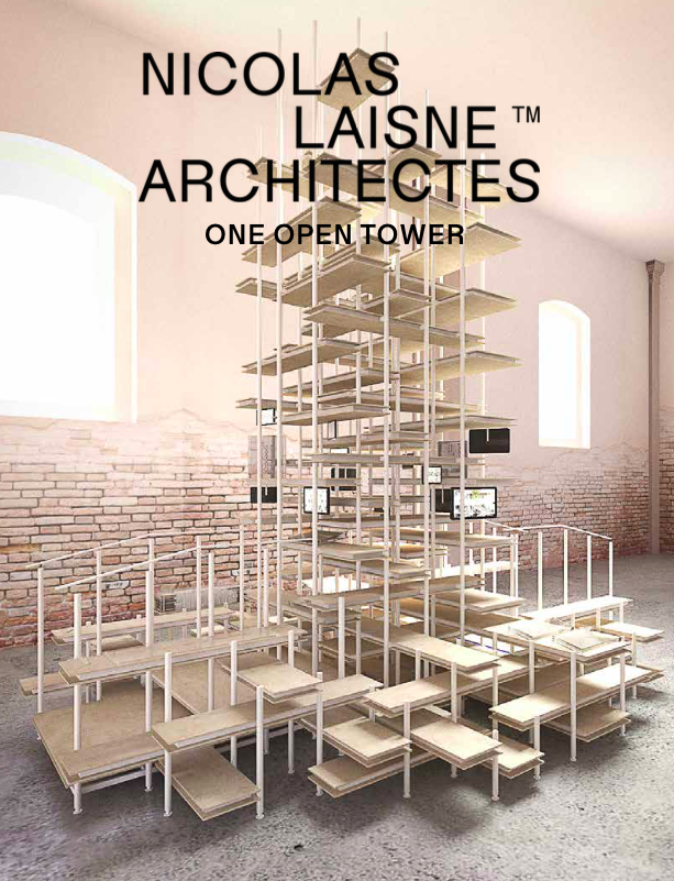 One Open Toweris a vertical metal Architecture-Sculpture, made with tubes welded together and wooden shelves. It is composed of two staircases accessible to the public and it is placed on the floor with jacks to make the level. In order to be movable, this Architecture-Sculpture is broken down into 11 elements assembled on site by bolting. It accommodates 12 screens with videos and 7 models in plexiglass, theses elements explains Nicolas Laisné Architectes architectural approach to the visitors encouraging immersion in the multiple life experiences that this future architecture will be able to stimulate in contemporary urban communities.