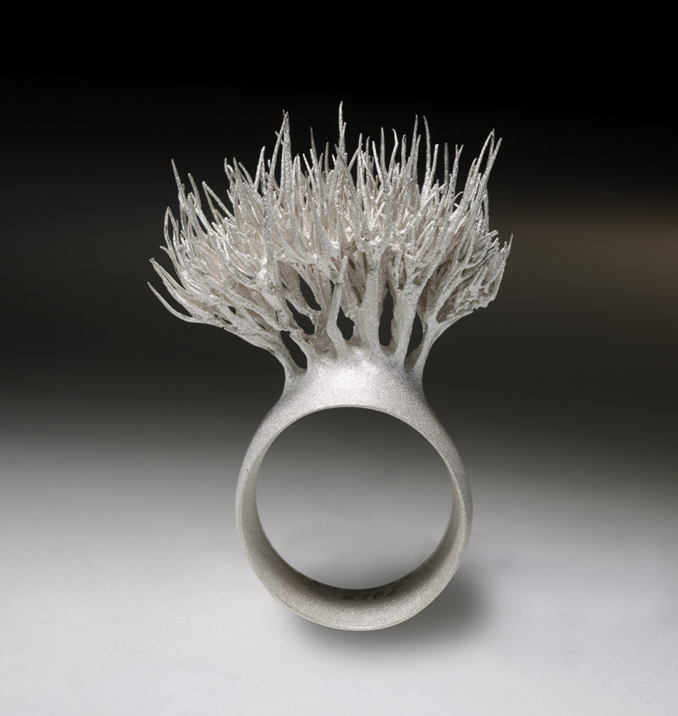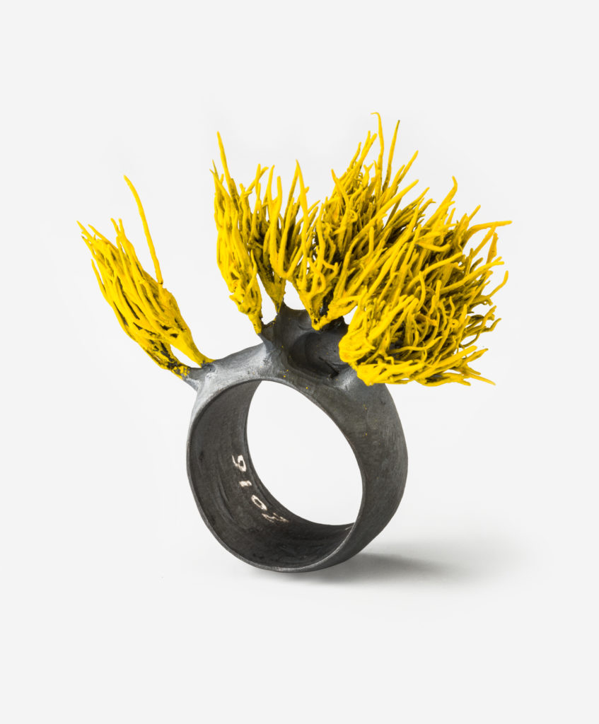 Aghi, spilli e forme naturali sporgono dal corpo degli anelli per conservare e contenere le forme morbide del vetro e l’infinita potenzialità del suo movimento. Un gioco erotico e sensuale si svolge tra le due entità, tra i metalli freddi e ruvidi e la purezza del vetro che emerge.