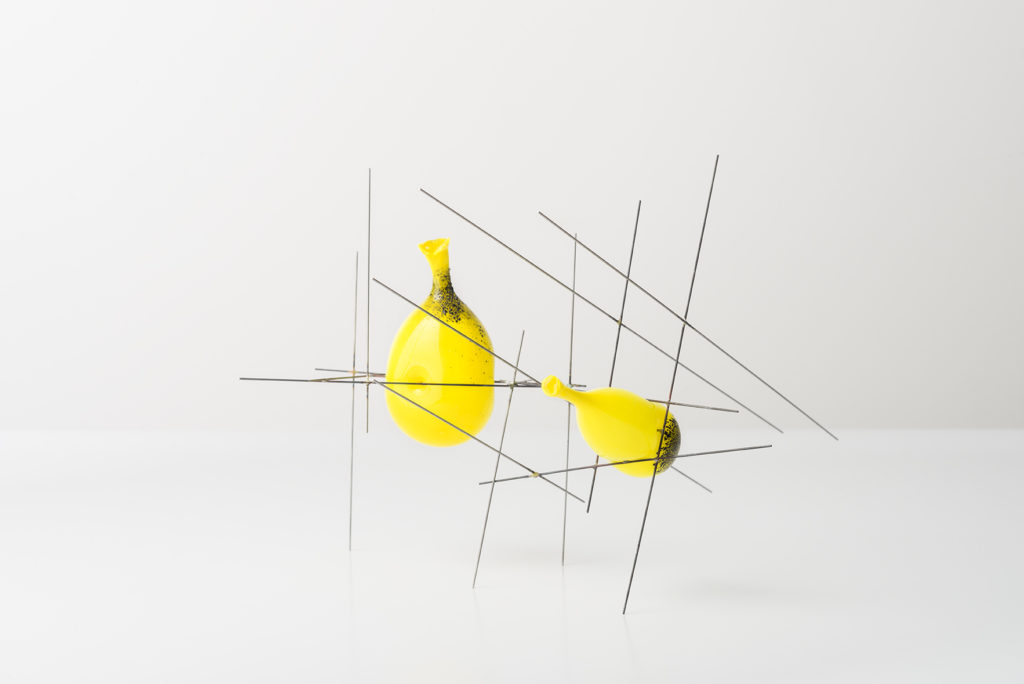 La complessa relazione tra metalli e vetro si sviluppa sia nella costruzione dei pezzi, che nei risultati estetici. Un rapporto conflittuale e inconscio, che sposta la funzione del metallo quale supporto ad un elemento costrittivo e ritentivo.